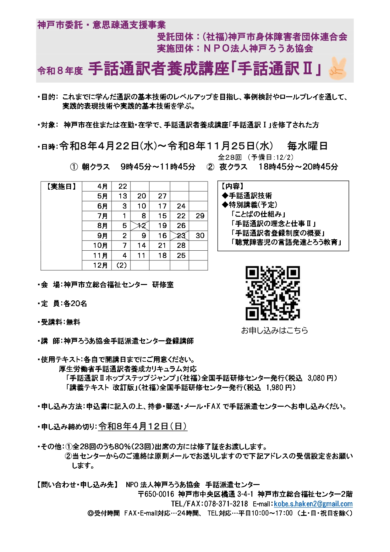 期間:5月14日~1月14日 毎週木曜日 全34回 朝・夜クラス